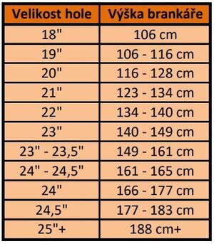Tabulka velikostí slouží pouze pro orientaci. U brankářských holí je vždy nejlepší vyzkoušet, záleží na postavení brankáře.